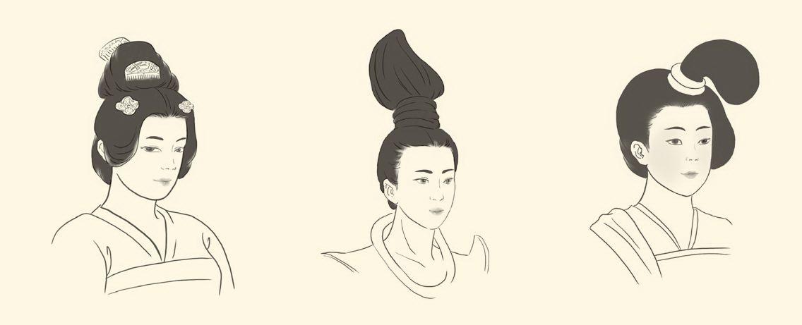 唐代女子发型百变,这里选取的是其中三种。据美籍华裔插画师Nancy Duong作品重绘,参考纳春英《唐代服饰时尚》和杨志谦《唐代服饰资料选》。