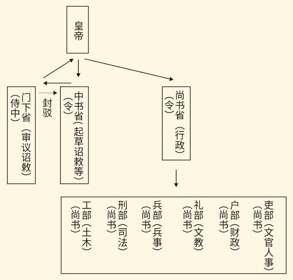 创设于唐初,经过几朝发展,三省六部制已经成为国家运转的核心机构。图据本中华史第十三卷《隋唐定局》。