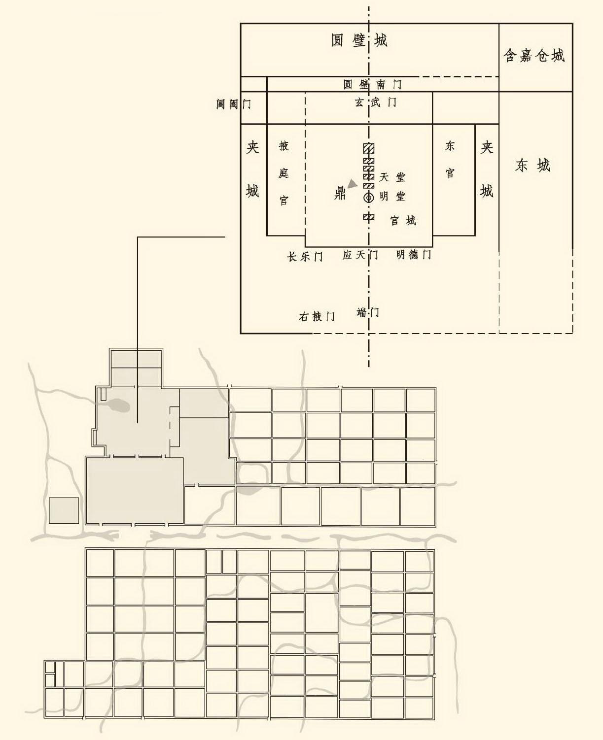 洛阳本为唐之东都,更名神都后,成为帝国的实际中心,并进行了相应的改造,建设了天堂、明堂等一系列建筑,宣告新时代的诞生。洛阳平面图据傅熹年《中国古代建筑史》,局部图据杨鸿勋《自我作古 用适于事——武则天标新立异的洛阳明堂》,原载《华夏考古》2001年第2期。